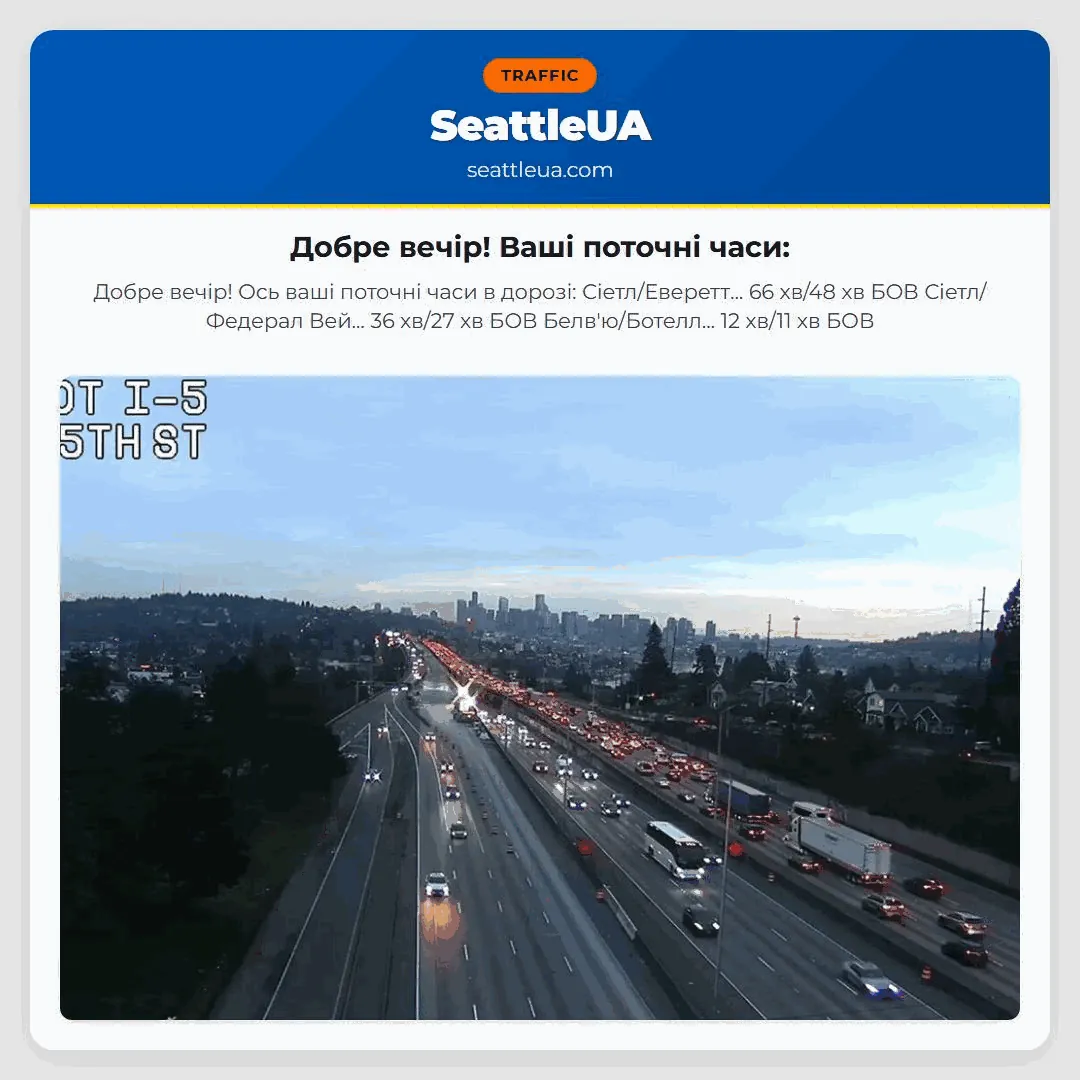 Добре вечір! Ось ваші поточні часи в дорозі: Сіетл/Еверетт… 66 хв/48 хв БОВ Сіетл/Федерал Вей… 36 хв/27 хв БОВ Белв’ю/Ботелл… 12 хв/11 хв БОВ