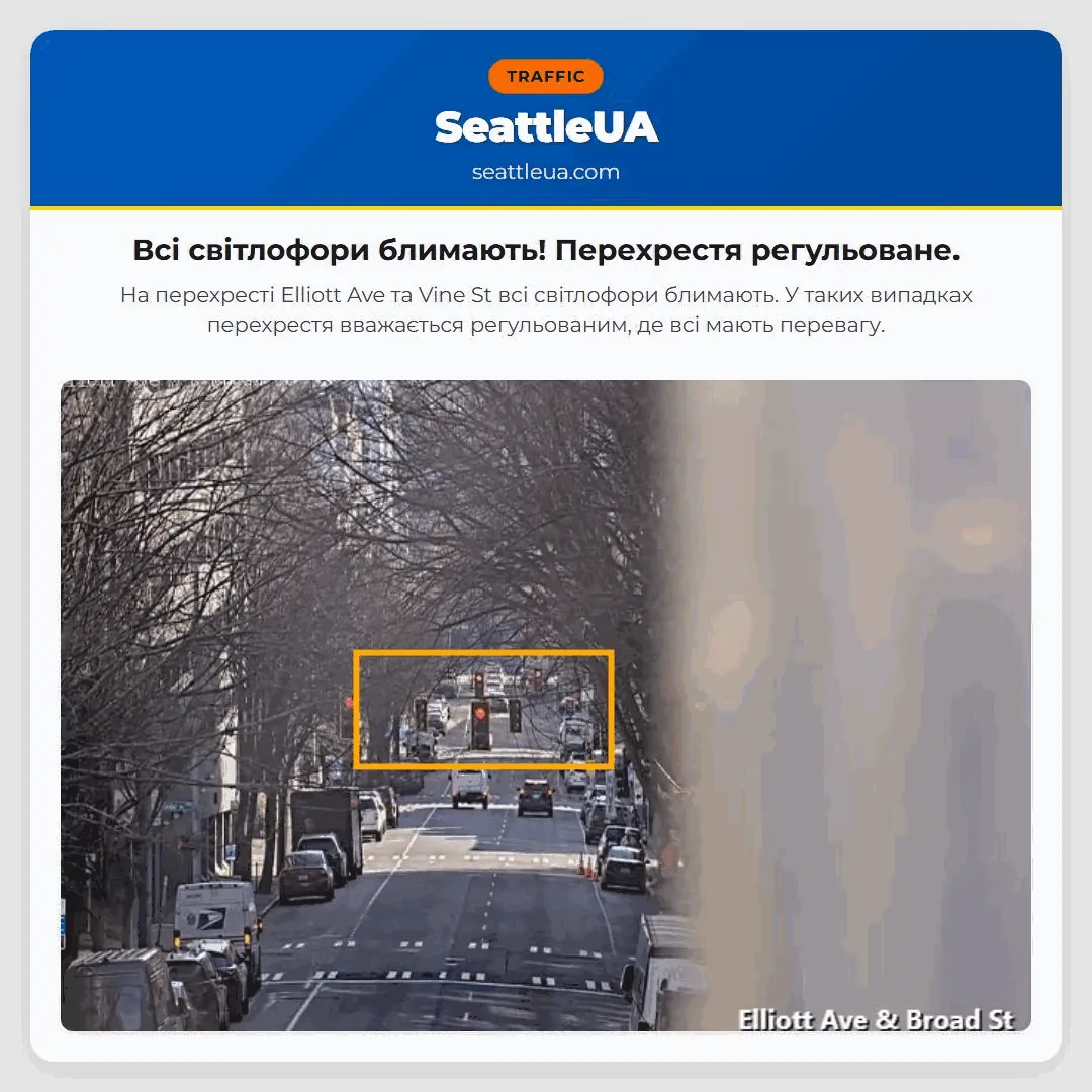 На перехресті Elliott Ave та Vine St всі світлофори блимають. У таких випадках перехрестя вважається регульованим, де всі мають перевагу.