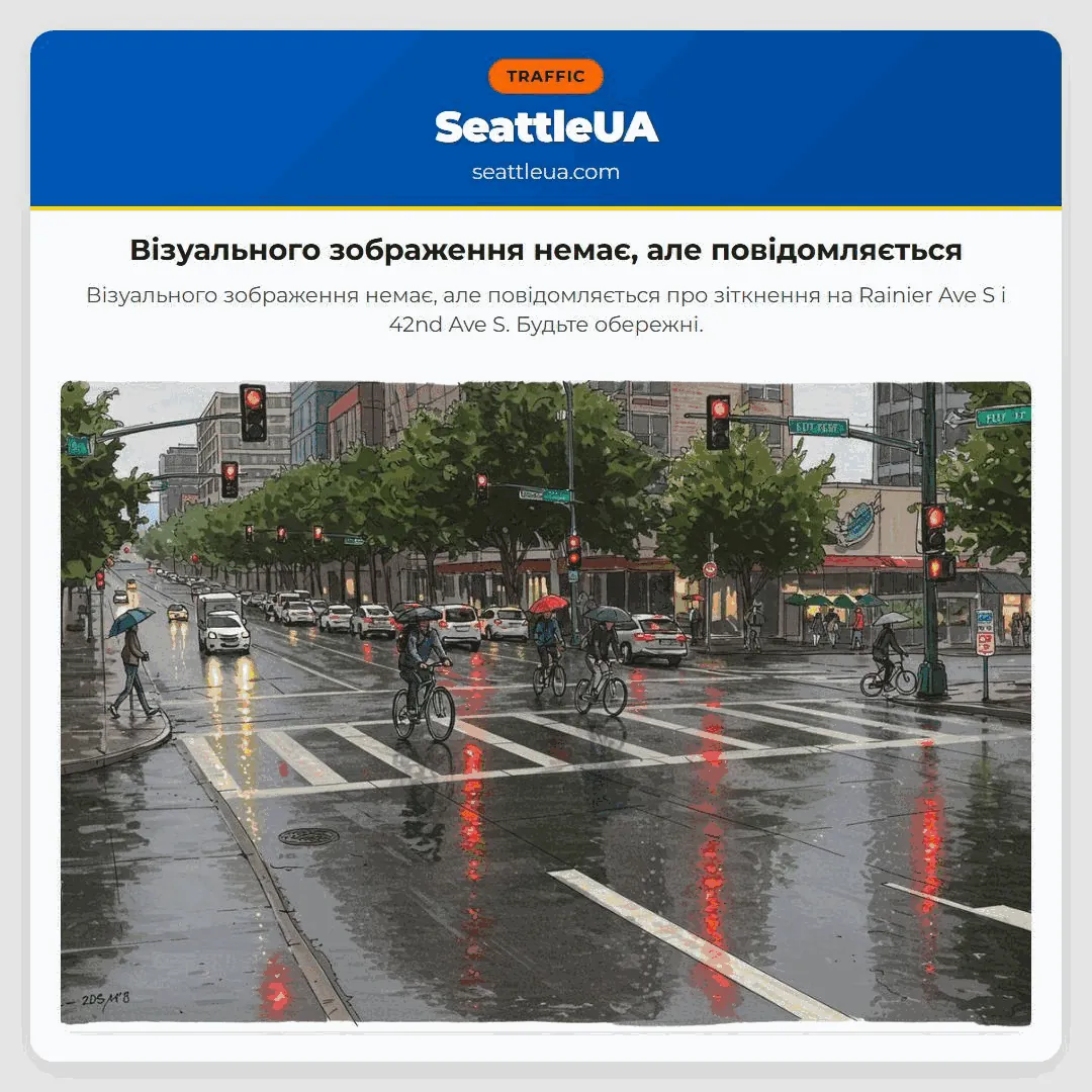 Візуального зображення немає, але повідомляється про зіткнення на Rainier Ave S і 42nd Ave S. Будьте обережні.