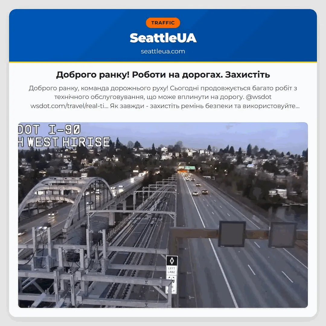 Доброго ранку, команда дорожнього руху! Сьогодні продовжується багато робіт з технічного обслуговування, що може вплинути на дорогу. @wsdot wsdot.com/travel/real-ti… Як завжди – захистіть ремінь безпеки та використовуйте додаткову обережність у зоні робіт.