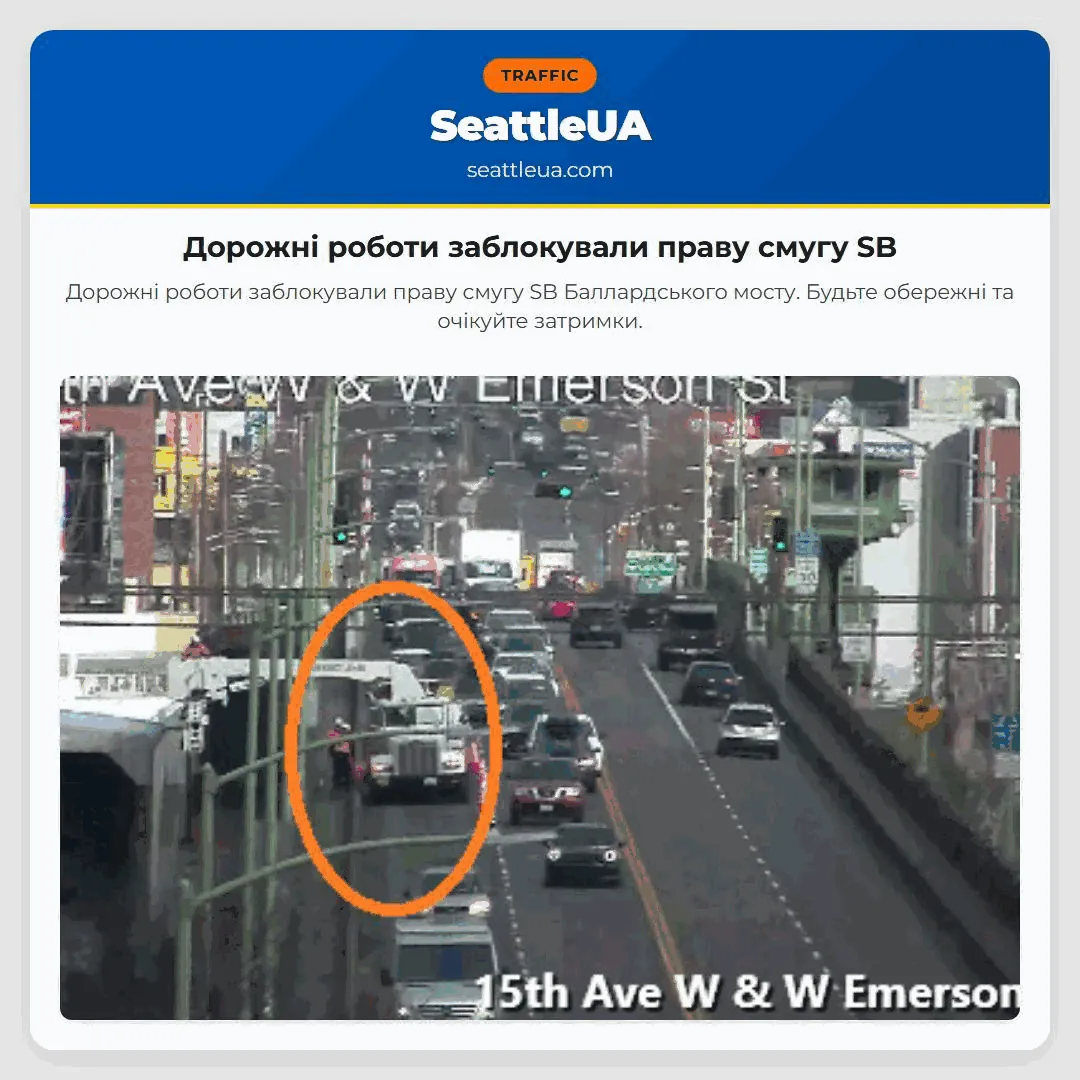 Дорожні роботи заблокували праву смугу SB Баллардського мосту. Будьте обережні та очікуйте затримки.
