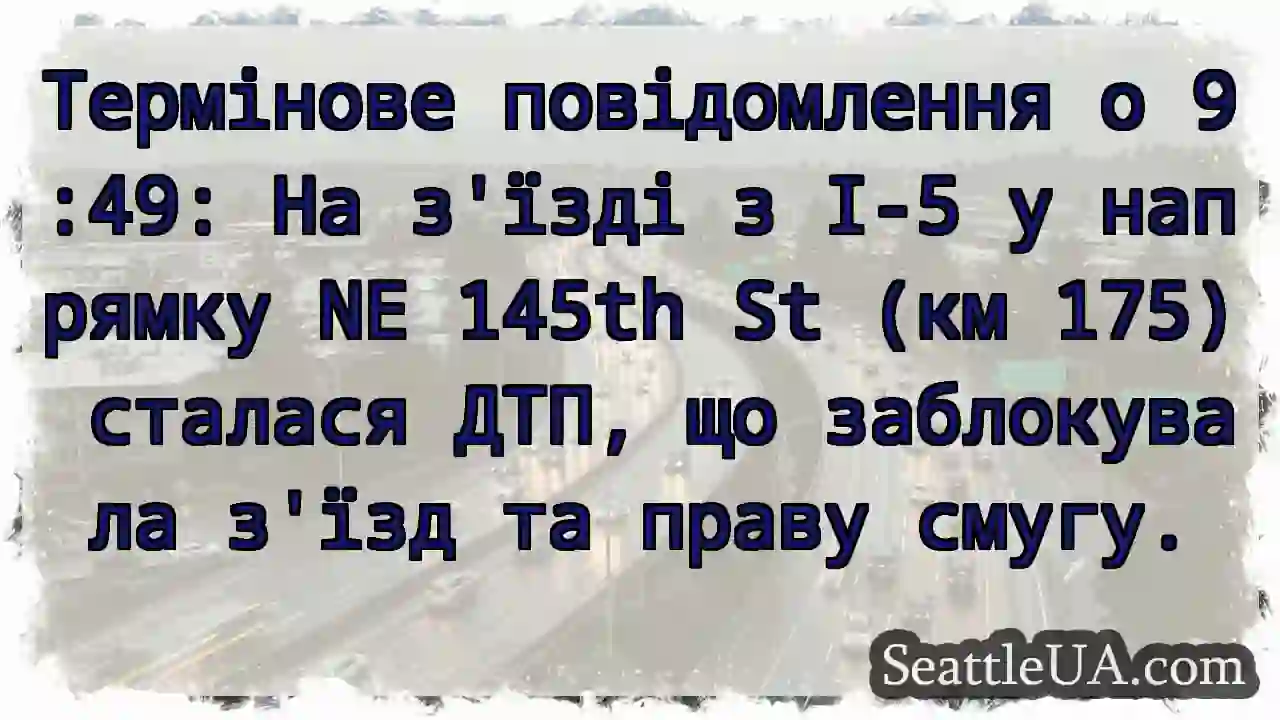 Термінове повідомлення о 9:49: На з’їзді з I-5 у напрямку NE 145th St (км 175) сталася ДТП, що заблокувала з’їзд та праву смугу.