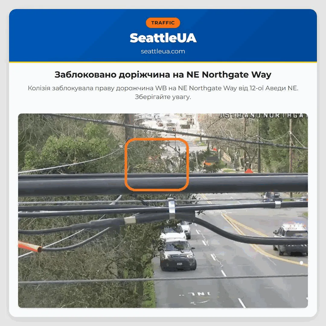 Колізія заблокувала праву дорожчина WB на NE Northgate Way від 12-ої Аведи NE. Зберігайте увагу.