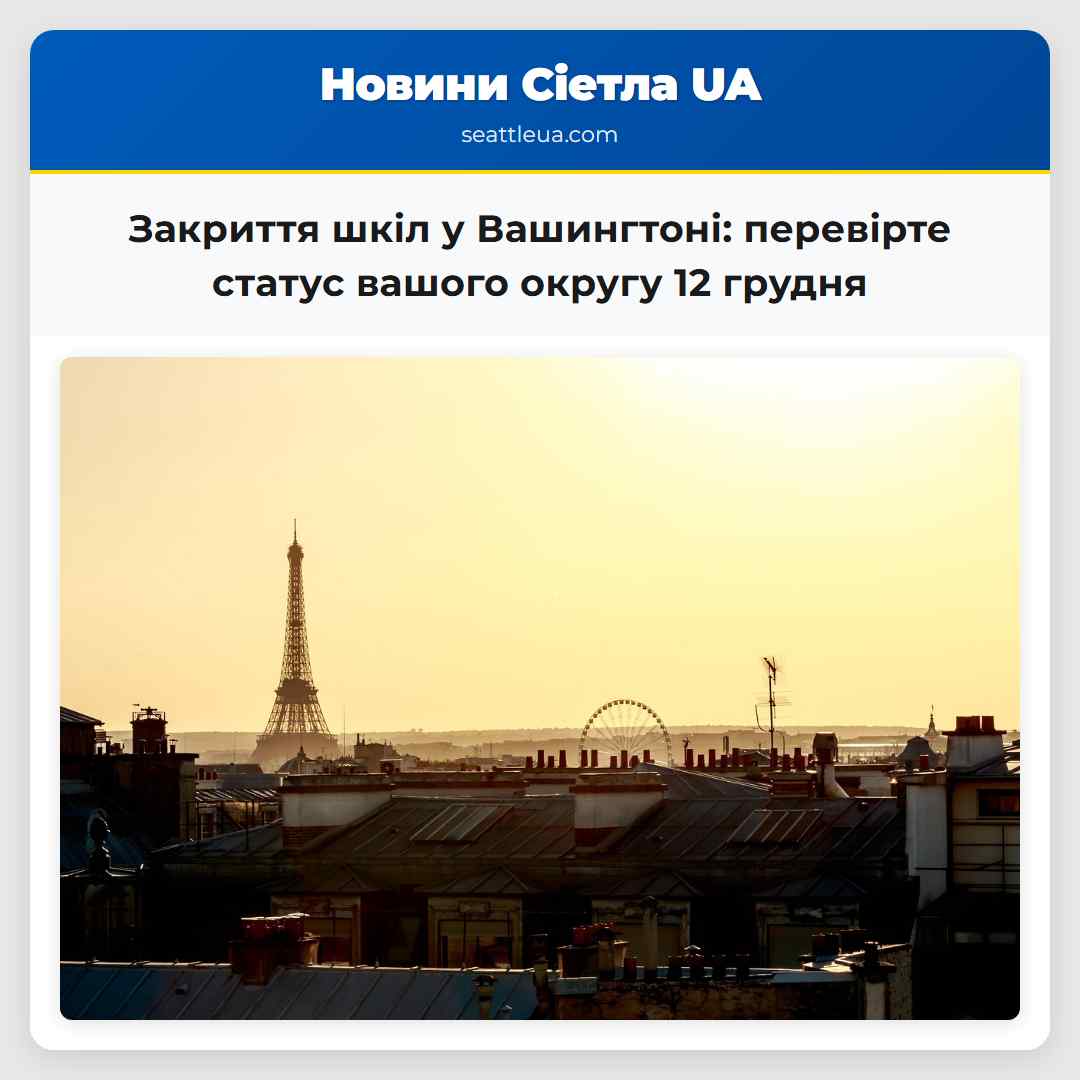 У зв’язку з несприятливими погодними умовами, 12 грудня деякі шкільні округи Західної частини Вашингтону оголосили про закриття або затримку занять. Перевірте статус вашого округу на офіційному сайті відповідного управління освіти або в місцевих новинах.