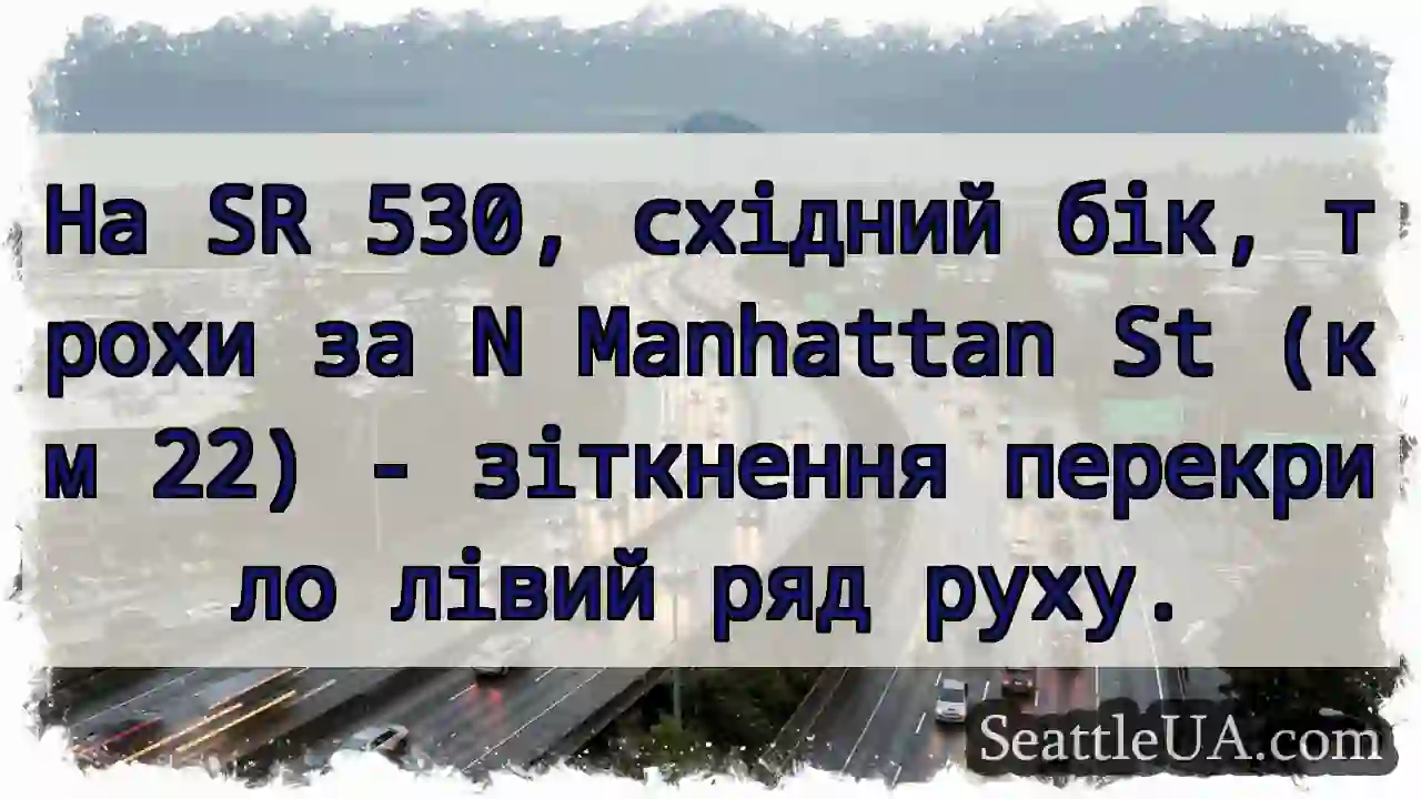 30.11.2025 09:10 Як пересуватися Сіетлом Зіткнення! Лівий ряд заблоковано. Зіткнення! Лівий ряд заблоковано. На SR 530, східний бік, трохи за N Manhattan St (км 22) – зіткнення перекрило лівий ряд руху. Останні новини Зіткнення! Лівий ряд заблоковано. Zderzenie! Lewy pas zablokowany. Zapore! SR 99, pri 1st Ave S. Dnes ob 8:51. Зіткнення на I-5! Часткова перекриття. Rentoni S slēgta! Ūdensvads bojāts. Sēattl Hālfmārathūn: Vēllī & Vēstlāk Ēv N! Ulica zamknięta! Seattle Half Marathon! З’їзд 520 ➡️ 405: зіткнення! Часткова перекриття. ⚠️ Seattle Half Marathon: Закриття доріг! Увага! Seattle Half Marathon – закриття доріг!