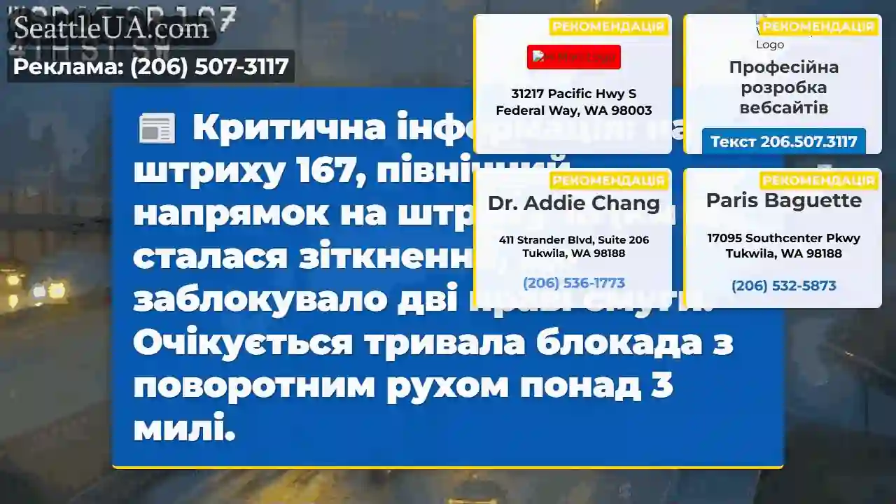 Критична інформація: на штриху 167, північний напрямок на штриху 18 (км 15), сталася зіткнення, що заблокувало дві праві смуги. Очікується тривала блокада з поворотним рухом понад 3 милі.