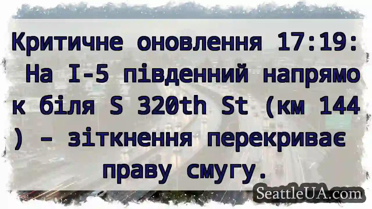 Критичне оновлення 17:19: На I-5 південний напрямок біля S 320th St (км 144) – зіткнення перекриває праву смугу.