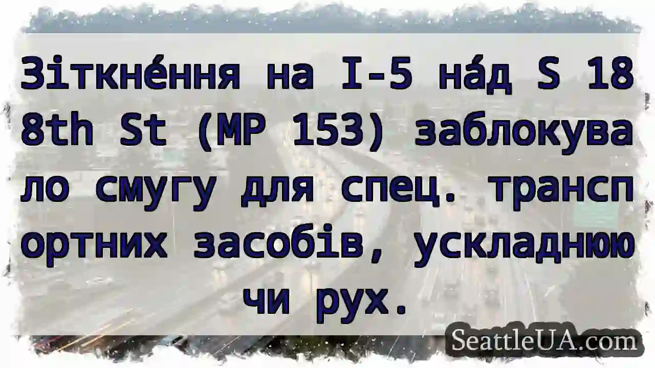 Зіткнéння на I-5 нáд S 188th St (MP 153) заблокувало смугу для спец. транспортних засобів, ускладнюючи рух.