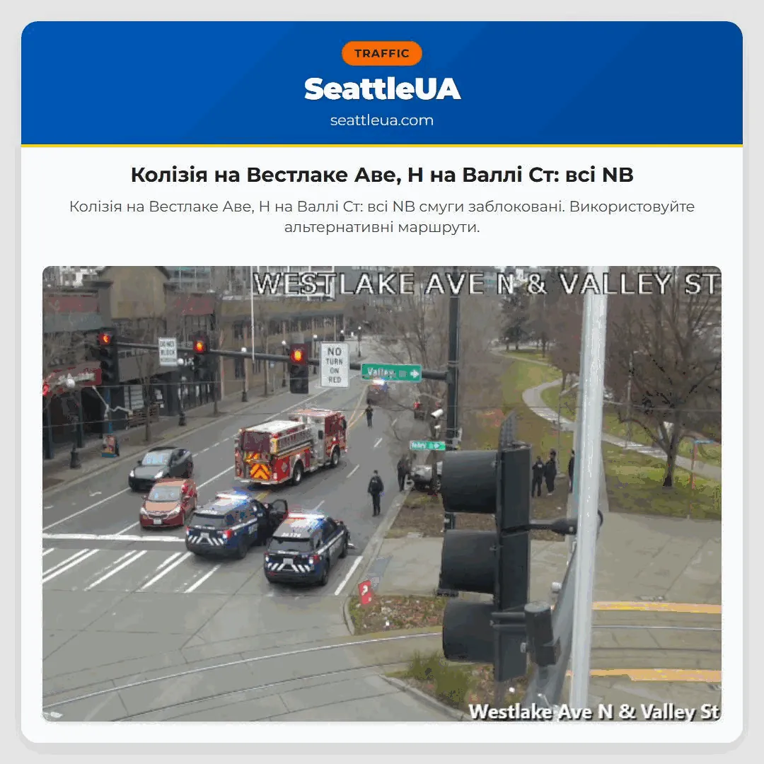 Колізія на Вестлаке Аве, Н на Валлі Ст: всі NB смуги заблоковані. Використовуйте альтернативні маршрути.