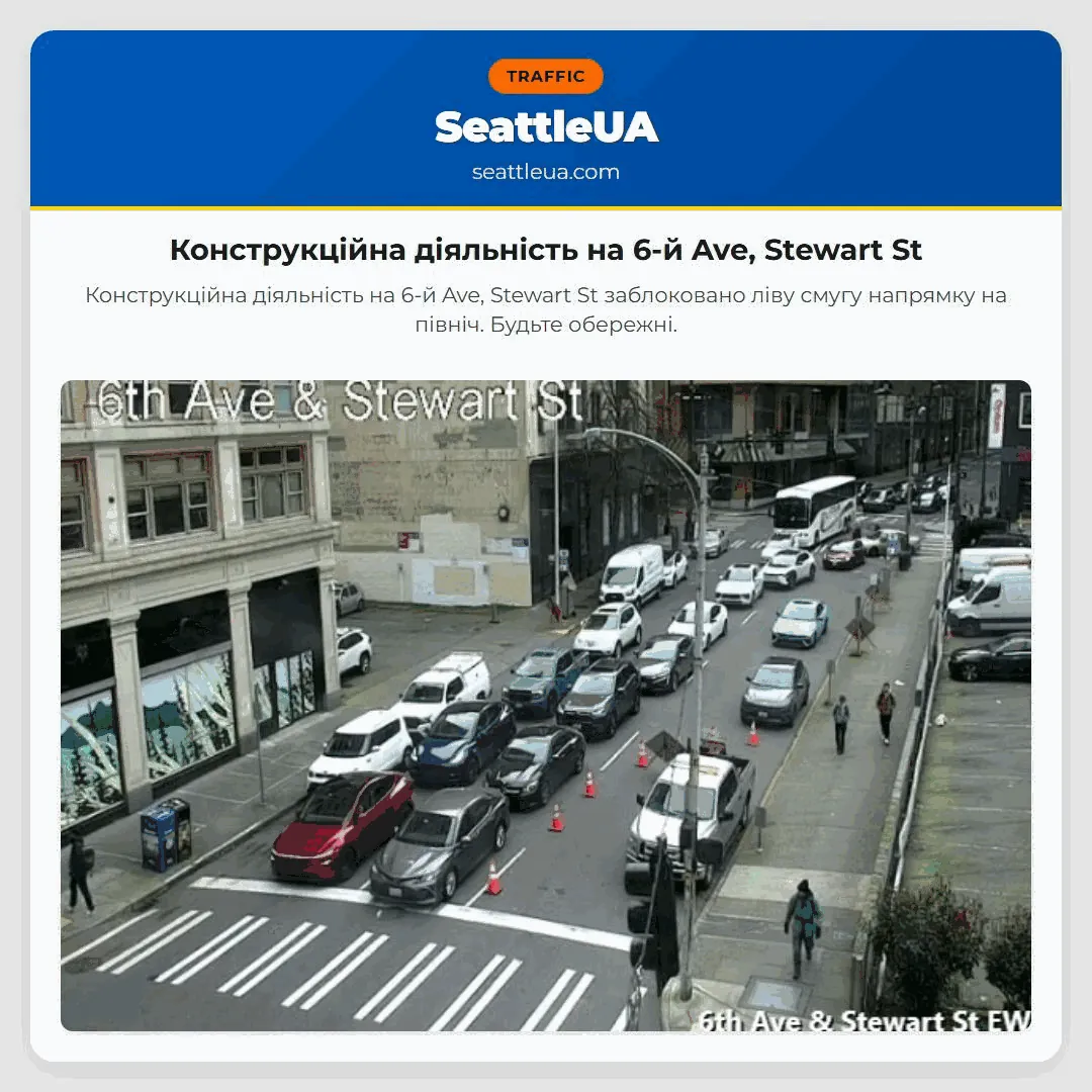 Конструкційна діяльність на 6-й Ave, Stewart St заблоковано ліву смугу напрямку на північ. Будьте обережні.