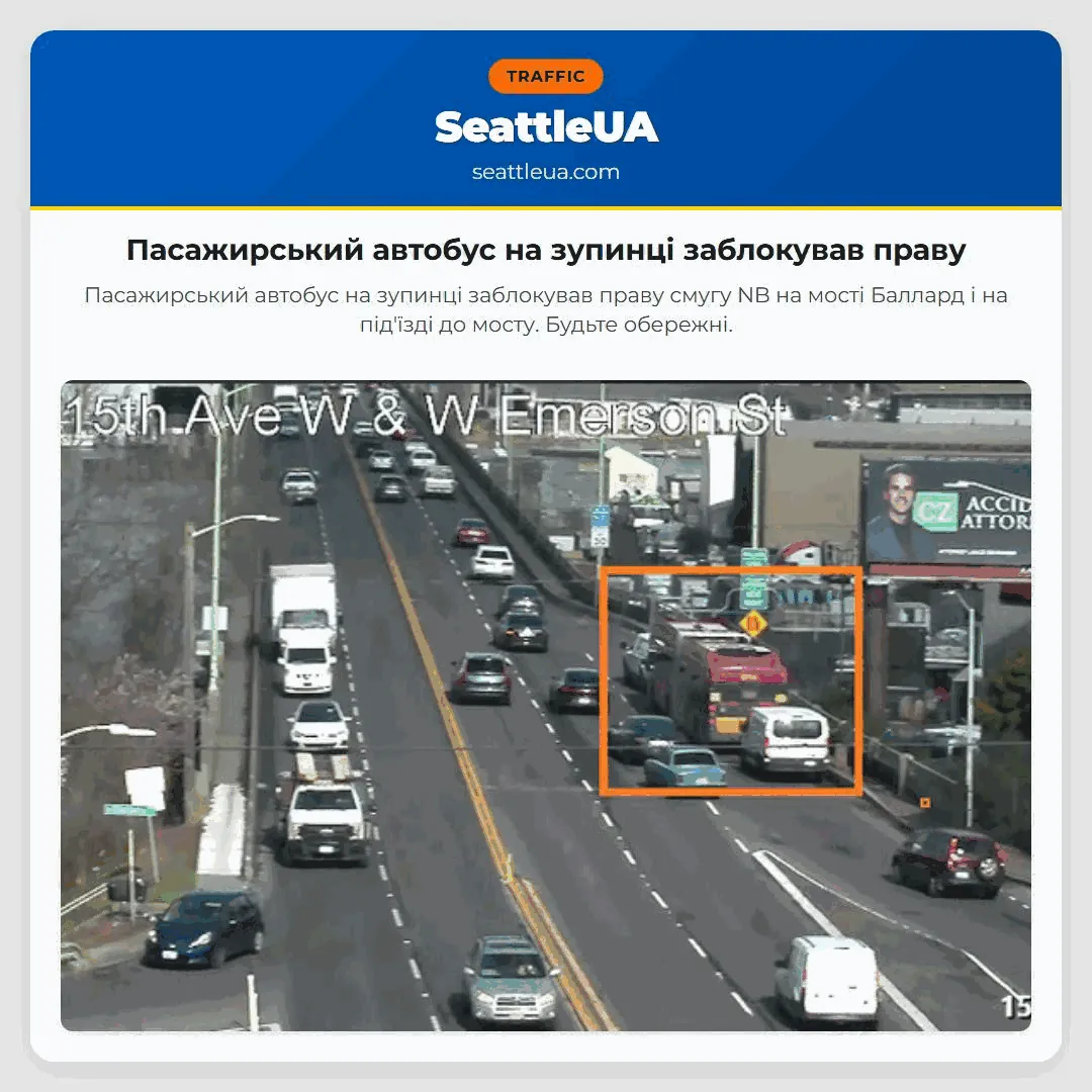 Пасажирський автобус на зупинці заблокував праву смугу NB на мості Баллард і на під’їзді до мосту. Будьте обережні.