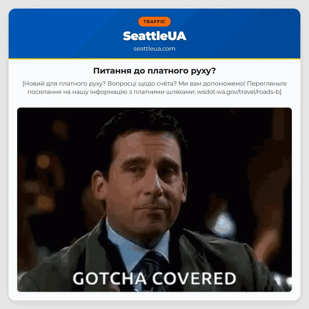 [Новий для платного руху? Вопросці щодо счёта? Ми вам допоможемо! Перегляньте посилання на нашу інформацію з платними шляхами: wsdot.wa.gov/travel/roads-b]
