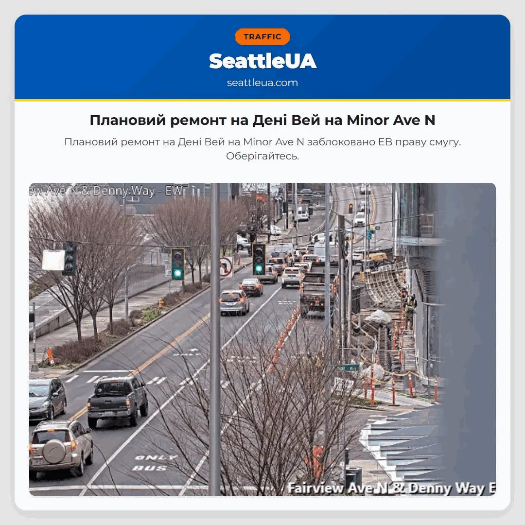 Плановий ремонт на Дені Вей на Minor Ave N заблоковано EB праву смугу. Оберігайтесь.