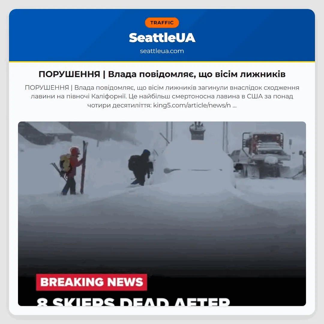 ПОРУШЕННЯ | Влада повідомляє, що вісім лижників загинули внаслідок сходження лавини на півночі Каліфорнії. Це найбільш смертоносна лавина в США за понад чотири десятиліття: