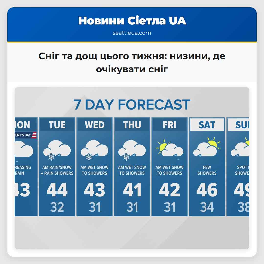 Сієтл – Холодна погода, яка прийде цього тижня, може збільшити ймовірність снігу в низинах, особливо вранці понеділка-середи. Дощ повертається понеділок, коли серія холодних систем впливає на регіон. Більшість низинних районів очікують дощ у перші дні, але в деяких місцях, таких як Худ Канал, можуть з’явитися мокрі снігопади. Температура залишиться достатньо високою, щоб сніг не зливалося, а опади протягом дня залишаться в основному дощовими.