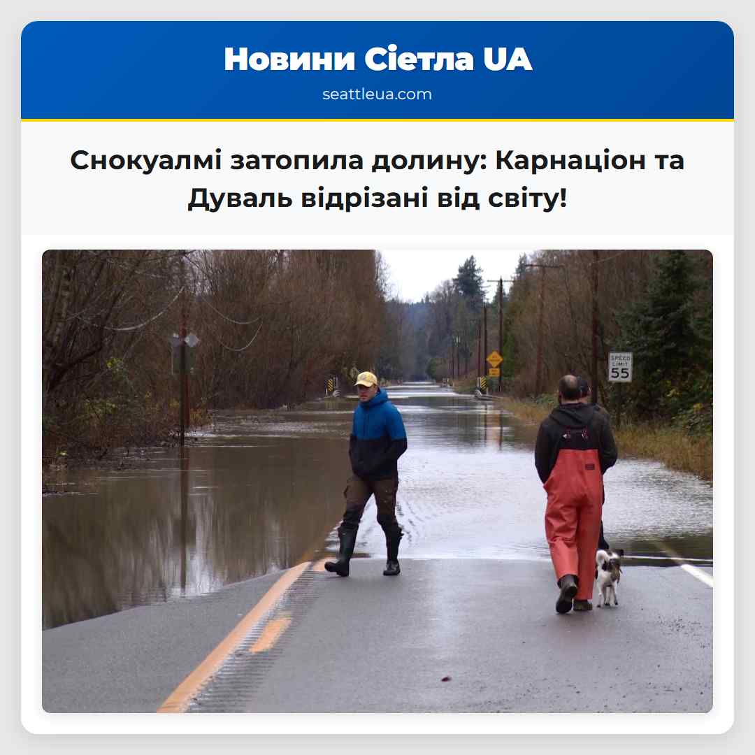 КАРНАЦІОН, штат Вашингтон – Рівень води в річці Снокуалмі у четвер перевищив 60 футів, перетворивши долину на величезне озеро та фактично відрізавши міста Карнаціон та Дуваль від навколишніх громад. Ця надзвичайна ситуація призвела до того, що колись зв’язані громади опинилися ізольованими, нагадуючи окремі села, що іноді зустрічаються в українських Карпатах під час сильних паводків.