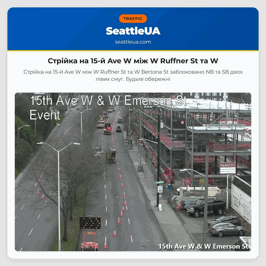 Стрійка на 15-й Ave W між W Ruffner St та W Bertona St заблоковано NB та SB двох лівих смуг. Будьте обережні
