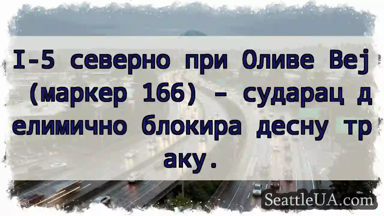I-5 северно при Оливе Веј (маркер 166) – сударац делимично блокира десну траку.