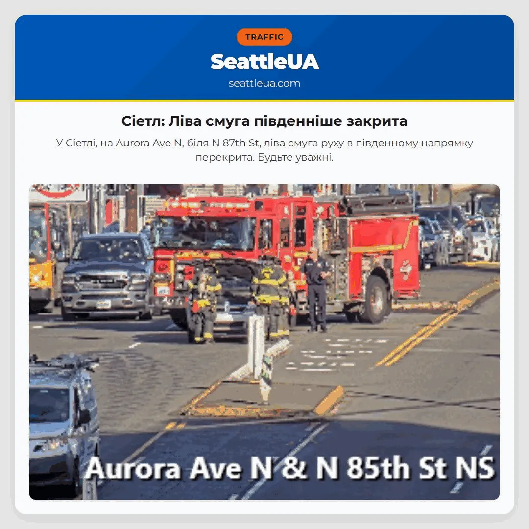 У Сіетлі, на Aurora Ave N, біля N 87th St, ліва смуга руху в південному напрямку перекрита. Будьте уважні.