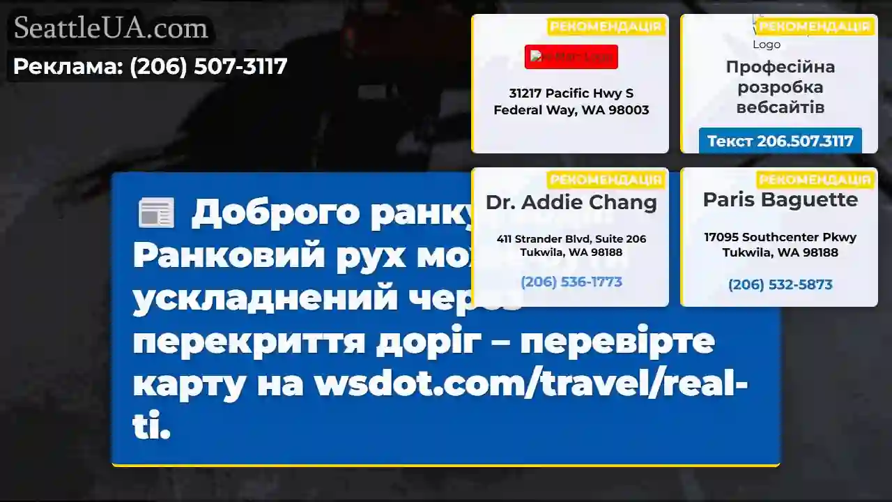 Доброго ранку, водії! Ранковий рух може бути ускладнений через перекриття доріг – перевірте карту на wsdot.com/travel/real-ti.