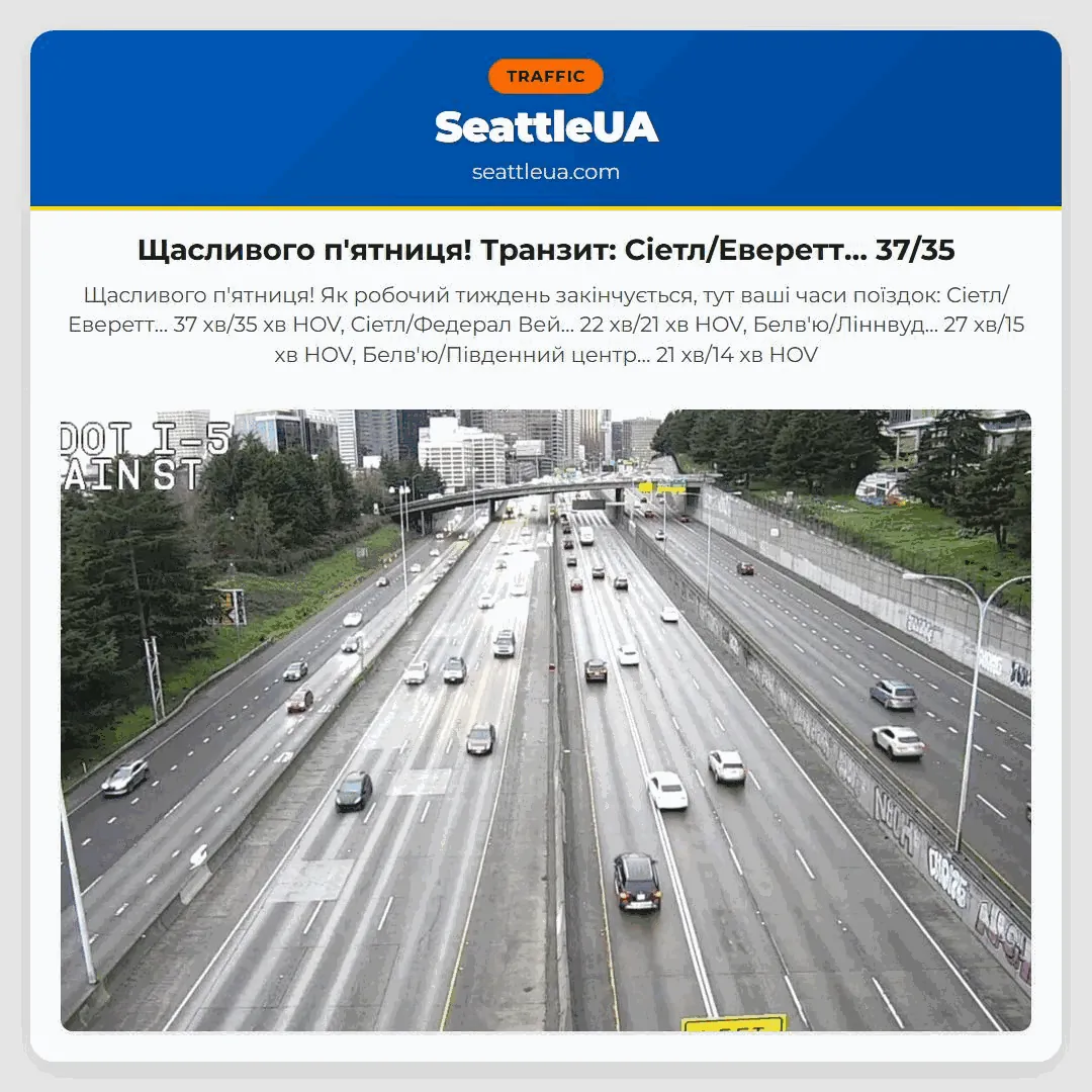 Щасливого п’ятниця! Як робочий тиждень закінчується, тут ваші часи поїздок: Сіетл/Еверетт… 37 хв/35 хв HOV, Сіетл/Федерал Вей… 22 хв/21 хв HOV, Белв’ю/Ліннвуд… 27 хв/15 хв HOV, Белв’ю/Південний центр… 21 хв/14 хв HOV