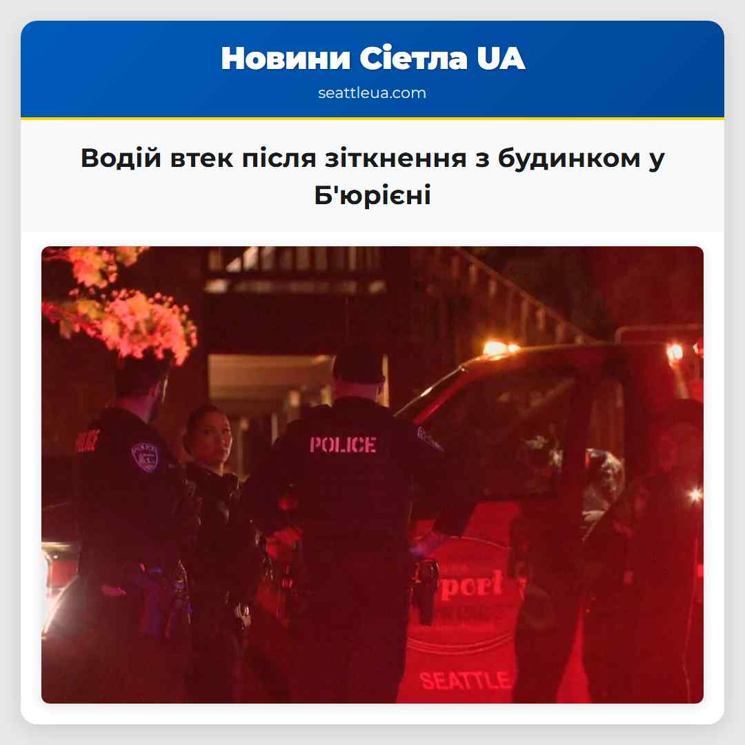 У Б’юрієні (штат Вашингтон) пожежники оцінять будинок, який було зіткнено автомобілем півночю. Незабаром після 3 годин ночі понеділка особові з Кінг-Каунті були викликані до ДТП на SW 126th St і Ambaum Boulevard Southwest, де автомобіль зіткнувся з стіною будинку. Повідомляє представник управління поліції Кінг-Каунті (KCSO), усі жителі будинку, які були зіткнені автомобілем, вийшли з будинку і залишаються у порядку. KCSO повідомили, що водій втек у після ДТП і зараз не арештований. Подія була класифікована як втік після ДТП.