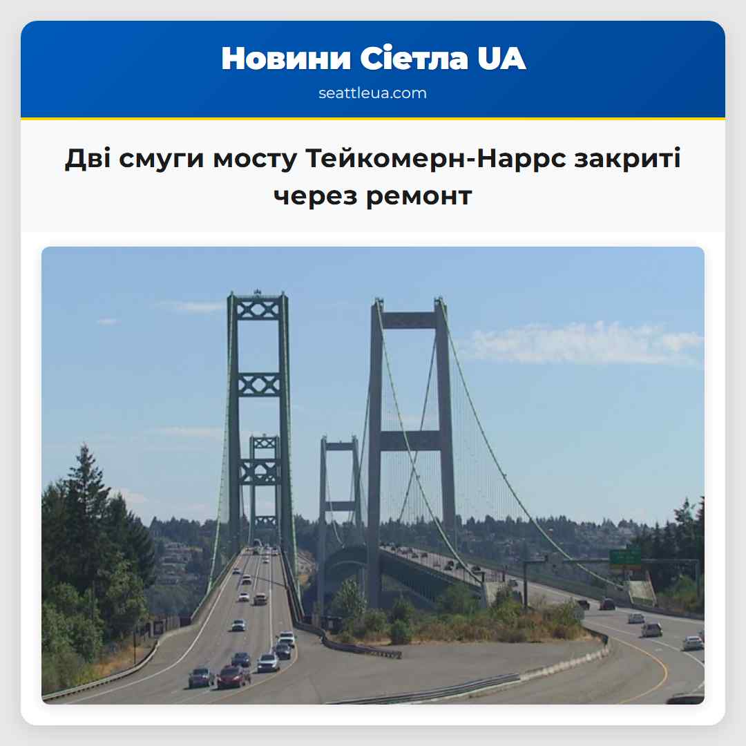 ТАКОМА, штат Вашингтон – Два смуги на південному напрямку мосту Тейкомерн-Наррс закриті через виявлення пошкоджень, повідомляє Департамент транспорту штату Вашингтон (WSDOT). Під час виконання інших ремонтних робіт робочі виявили зношування на конструкції, яка підтримує з’єднання під двома правими смугами транспортного потоку на південному напрямку. Дві праві смуги залишаться закритими протягом усієї доби, а можливо, й протягом вихідних, повідомили в WSDOT. Дві ліві смуги південного напрямку залишаються відкритими та безпечними для проїзду. Офіційні особи просили водіїв обмежити проїзд через міст і рухатися повільно поблизу місць будівництва. Поверхня відокремленої смуги для транспортних засобів з високим рівнем екологічної ефективності (HOV) відкрита для усіх водіїв під час виконання робіт. Закрито вхідне коло з вулиці Джексона до південного напрямку шосе 16. Міст Тейкомерн-Наррс, як він виглядає сьогодні, має 76 років і був побудований у 1950 році. Міст пройшов восьмірічну екстренну ремонтну роботу між 2024 та 2025 роками, усі з яких були пов’язані з з’єднаннями мосту, повідомили в WSDOT.