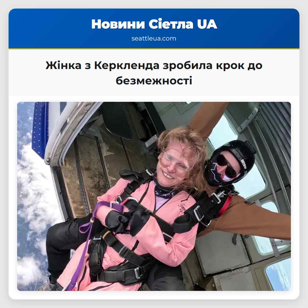 Керкленд, штат Вашингтон – Вони говорять, що ‘небо – безмежне’, але для жінки з Вашингтону, яка страждає квадрипелією, це не зовсім так. Танія Фінлайсон здійснила парашутистський стрибок 54-ий раз, а цей раз у минулі вихідні вона здійснила стрибок разом з партнером з висоти близько 18 000 футів. ‘Вона досягла швидкості 125 миль на годину, встановивши рекорд штату Вашингтон’, – сказав її чоловік Кен Фінлайсон. Що робить цей момент особливим, таке, що Танія не може використовувати руки, ноги або язик. Жінка з Керкленда народилася з церебральною паралізом. Танія Фінлайсон у процесі парашутизму.