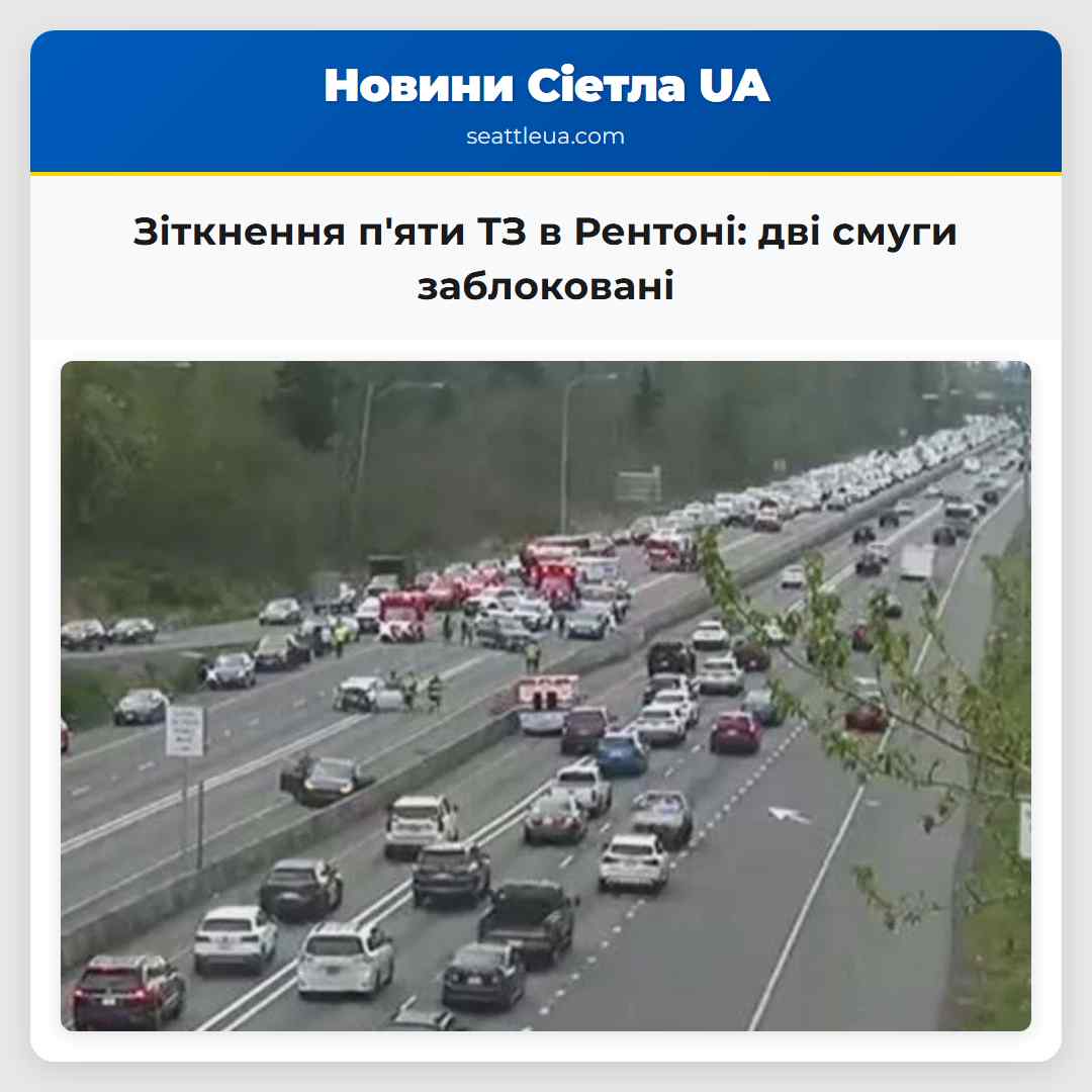 У Рентоні сталося зіткнення п’яти транспортних засобів, що заблокувало кілька смуг північного напряму SR 167 у Кенті, південної частини міста. Поліція шукає водія, який після ДТП втекав пішохідно. Зіткнення відбулося на Східній 180-й вулиці поблизу мильного знаку 25 незабагато після 14:00. Департамент транспорту штату Вашингтон повідомив, що зіткнення заблокувало дві ліві смуги. Патруль штату Вашингтон назвав подію ‘зіткненням п’яти транспортних засобів з пораненими’. Водія, якого вважають винуватимим, втекав пішохідно. Поліція все ще шукає підозрюваного водія о 14:30. Незважаючи на кількість уражених транспортних засобів, найсерйознішою повідомленою травмою була ‘можливо перелом стопи’. Оцінки часу відкриття смуг не надали, але тягнів було відправлено як мінімум.