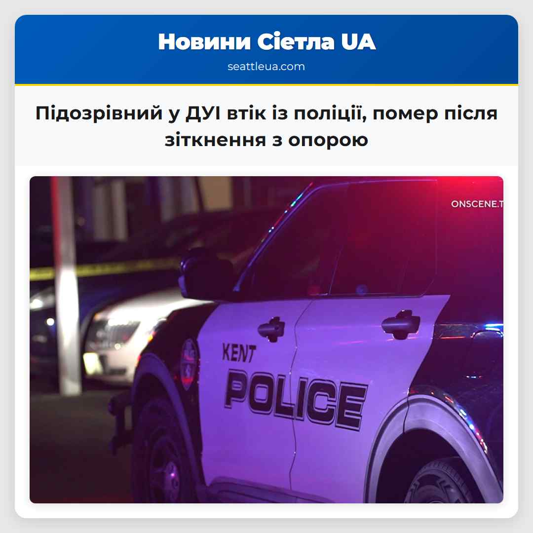 Кент, штат Вашингтон – Поліція Кента повідомила, що підозрівний у ДУІ, який втік під час зупинки пізно в неділю, помер після зіткнення з опорою електромережі. Поліцейський виявив підозрівного водія у центрі міста о 21:21 25 квітня та намагався виконати зупинку. Автомобіль прискорився, намагався утекти від офіцера, відмовляючись зупинятися, і офіцер відбіг за ним, як він їхав на північ по вулиці Вашингтон. Пізніше водій втратив контроль на перехресті Вест Валлі Вей і Східної 228-ї вулиці та зіткнувся з опорою електромережі. Кілька поліцейських прибули та знайшли водія без свідомості, в’язаного в машині. Щоб отримати доступ до чоловіка та оцінити його стан здоров’я, поліцейські розбили скло автомобіля, а потім встановили, що він не дихав. На місці події поліція почала реанімаційні заходи, включаючи відкриття дверей автомобіля для виведення чоловіка, використання автоматичного зовнішнього дефібрилятора та виконання масажу серця. Медики Кінг Конті взяли ведення у лікування, але водій не вижив і помер на місці події. Водія визначили як 56-річного мешканця Сіетла. Поліція повідомила, що в зіткненні не брало участь інших транспортних засобів або людей. Було здійснено виклик служби штату Вашингтон для проведення розслідування зіткнення, яке поліція Кента вважає звичайною процедурою для подій такого роду.