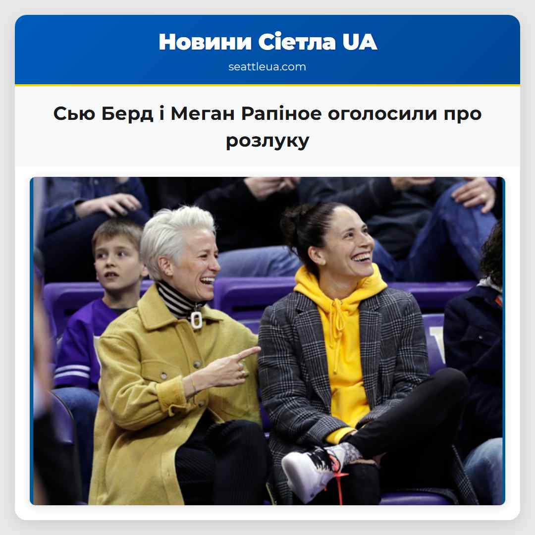 У Сієтлі спортсмени Сью Берд і Меган Рапіное оголосили про розлуку у спільному Instagram-повідомленні п’ятниці. У повідомленні вони відзначили, що ніякого плавного або простого способу поділитися цим новином не існує, але після багатьох роздумів вони прийняли рішення про розлуку як пара. ‘Це складне рішення, але яке ми прийняли разом з величезною любов’ю, повагою та увагою до однієї одної’, – наголосили вони. У повідомленні вони також відзначили, що разом вони поділили повну життя за останній десяток років, пройшовши великі моменти, і це щось, що вони завжди зберемо з собою. Пара висловила подяку підтримці, яка залишалася з їхньою відносинами протягом років. ‘Ми дуже вдячні цій неймовірній спільноті, яка підтримувала нас, вітала нас і підтримувала нас точно так, як ми є. Так багато з вас нагадували нам, що значить любити гучно, багато разів’, – додали вони. Вони також зазначили, що їхня робота разом на ‘A Touch More: The Podcast’ була для них дуже важливою, але ця частина їхнього партнерства закінчується. ‘Ми з величезною радістю створювали ‘A Touch More: The Podcast’ і будували навколо нього мережу. Діалоги, сміх, зв’язок – це значить більше, ніж ми можемо висловити словами. Незважаючи на те, що цей епізод створення podcast-у разом закінчується, те, що ми з вами збудували, не закінчується’, – написали вони. Берд і Рапіное були однією з найвідоміших спортивних пар Сієтла. Вони оголосили про свій шлюб у жовтні 2020 року у пості на Instagram, який показував Рапіное на одній коліні, яка покладає кільце на палець Берд. Пост отримав тисячі лайків і вітань. Берд грає за команду Seattle Storm з моменту драфту в 2002 році, а в 2020 році допомогла команді виграти четвертий чемпіонат WNBA. Вона відмовилася від спорту після сезону 2022 року. Рапіное ставла себе в передову фігуру для американської збірної з футболу під час Кубка світу для жінок 2019 року. У 2021 році пара давала інтерв’ю NBC про те, як вони зустрілися вперше під час фотосесії на Олімпійських іграх 2016 року в Ріо. ‘Вона була в баскетбольному відгуку і мала розпущений волосся’, – сказала Рапіное. ‘Ми випадково зустрілися, і вона сказала: ‘О, як! Готова до твого матчу?’ – відповіла Берд. ‘Я сказала: ‘ха-ха… це смішно’, – відповіла Берд. ‘Я пішла, якби вона сказала: ‘чому ти навіть не сказала?’ – сказала Рапіное. ‘Я зробила дуже поганий враження’, – додала Берд. ‘Так дурно, я пішла, якби ви думали, що ви повинні бути крутими? Ми тепер сміються над цим, бо вона була повністю дурна’, – додала Берд. Під час цього інтерв’ю обидві згадали про їхню зв’язок як про висококваліфікованих спортсменів. Берд сказала, що одним з їхніх улюблених речей разом було готувати їжу, бо це означало, що вони ділилися додому, що вона вважала рідкісним. ‘Я думаю, що бути висококваліфікованим спортсменом – це дуже унікальний досвід, і бути у ділі з кимось, хто має такий самий досвід, це дуже вражаюче’, – сказала Берд. ‘Ну насправді, якщо чесно, це дуже звичайне, але я знаю, що вона в статусі GOAT, – сказала Рапіное. – Я не знаю, ми просто нормальні, ми дуже бідні й хочемо сидіти на дивані й робити те, що роблять більшість людей’.