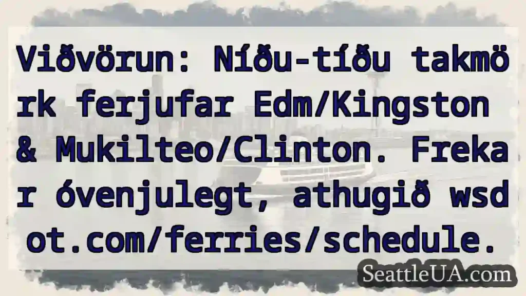 Viðvörun: Níðu-tíðu takmörk ferjufar Edm/Kingston & Mukilteo/Clinton. Frekar óvenjulegt, athugið wsdot.com/ferries/schedule.