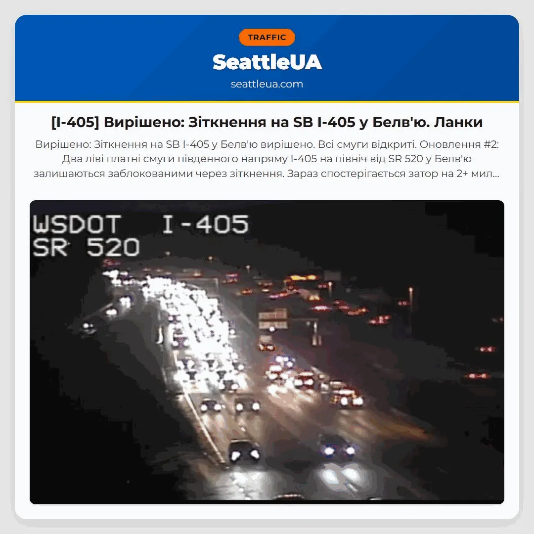 Вирішено: Зіткнення на SB I-405 у Белв’ю вирішено. Всі смуги відкриті. Оновлення #2: Два ліві платні смуги південного напряму I-405 на північ від SR 520 у Белв’ю залишаються заблокованими через зіткнення. Зараз спостерігається затор на 2+ миль. Очікуйте затримки у цій зоні @bellevuewa x.com/wsdot_traffic/…