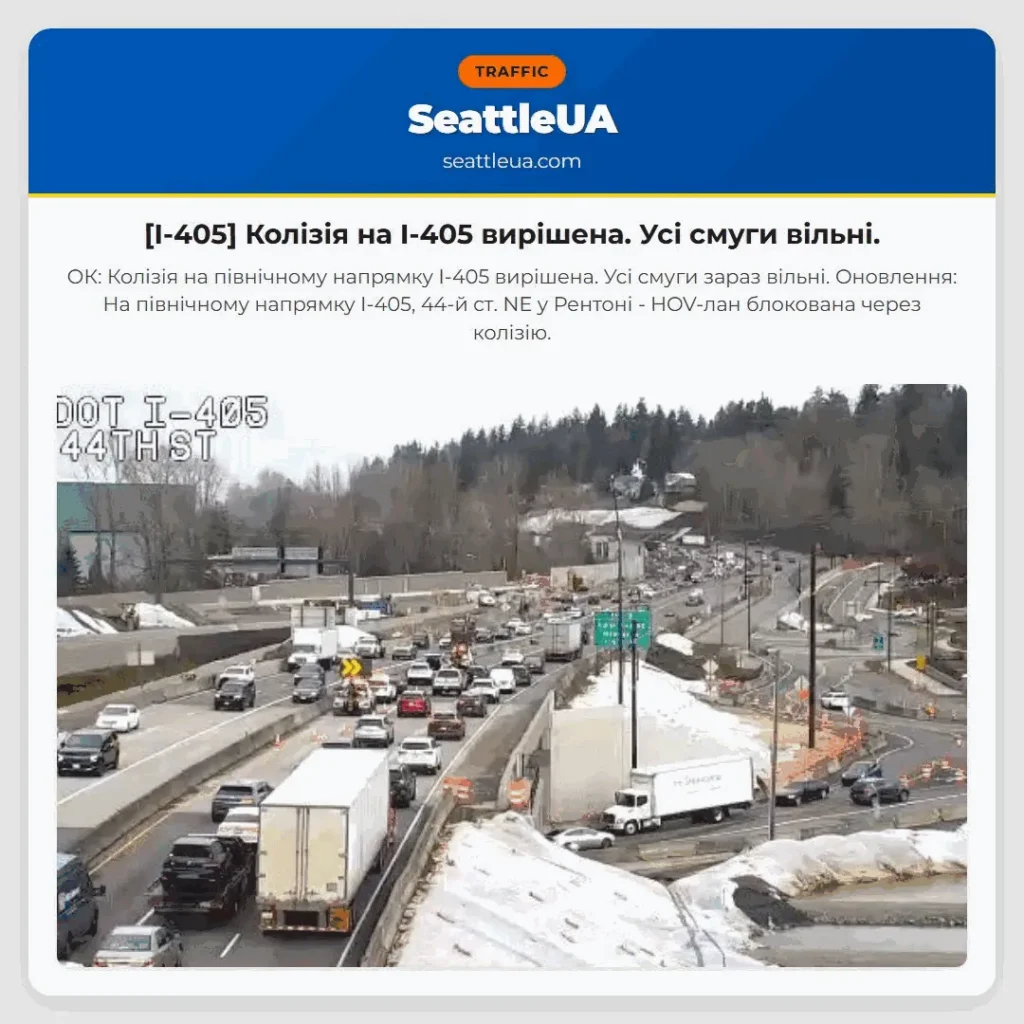 ОК: Колізія на північному напрямку I-405 вирішена. Усі смуги зараз вільні. Оновлення: На північному напрямку I-405, 44-й ст. NE у Рентоні – HOV-лан блокована через колізію.