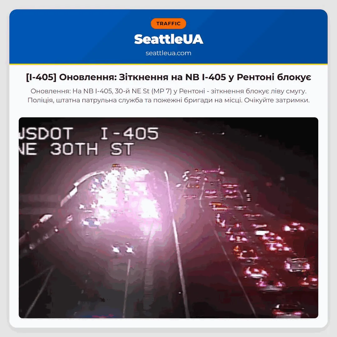 Оновлення: На NB I-405, 30-й NE St (MP 7) у Рентоні – зіткнення блокує ліву смугу. Поліція, штатна патрульна служба та пожежні бригади на місці. Очікуйте затримки.