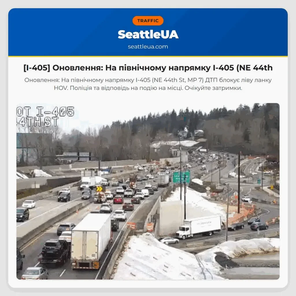 Оновлення: На північному напрямку I-405 (NE 44th St, MP 7) ДТП блокує ліву ланку HOV. Поліція та відповідь на подію на місці. Очікуйте затримки.