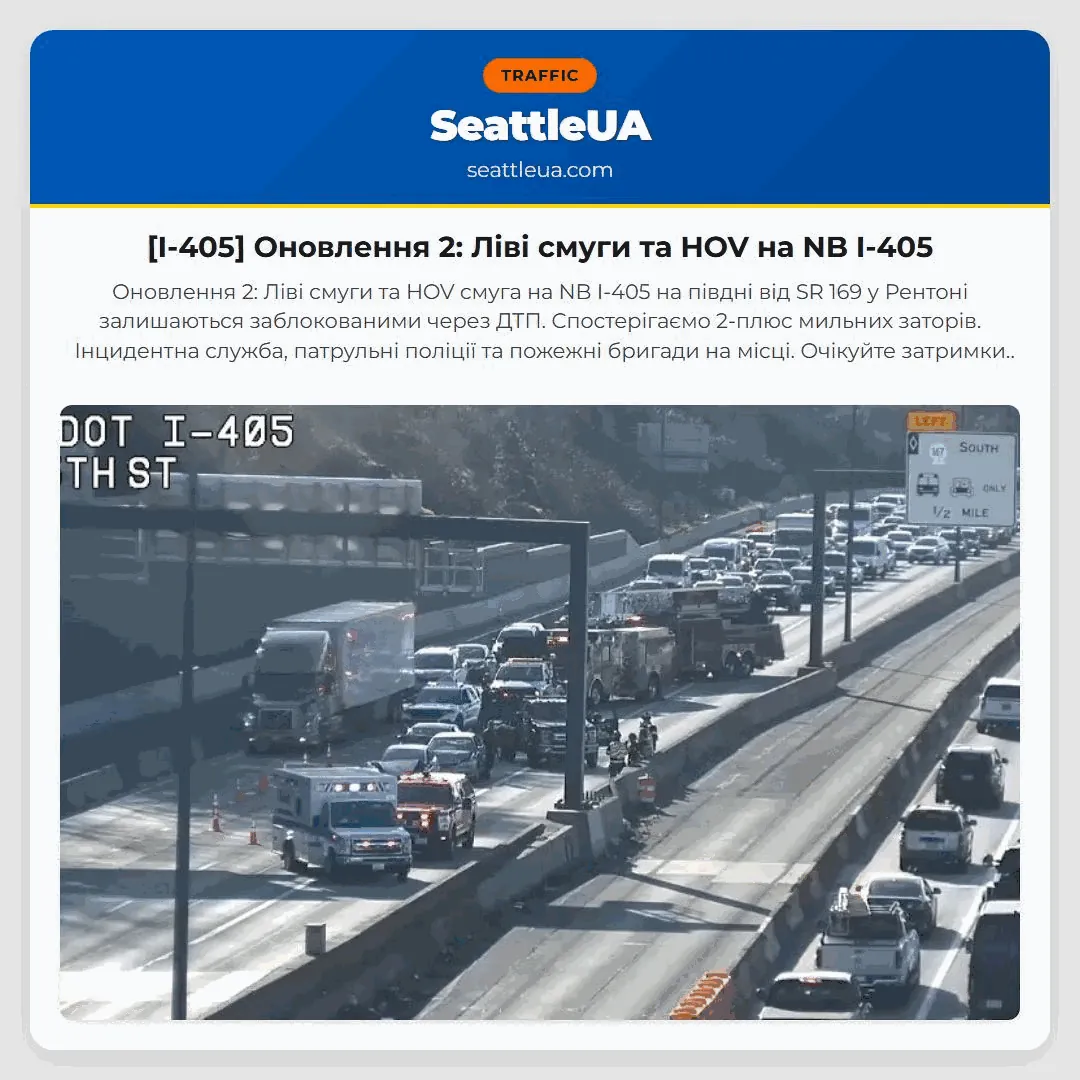 Оновлення 2: Ліві смуги та HOV смуга на NB I-405 на півдні від SR 169 у Рентоні залишаються заблокованими через ДТП. Спостерігаємо 2-плюс мильних заторів. Інцидентна служба, патрульні поліції та пожежні бригади на місці. Очікуйте затримки або шукайте альтернативні маршрути.