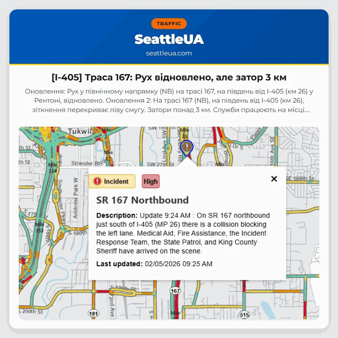 Оновлення: Рух у північному напрямку (NB) на трасі 167, на південь від I-405 (км 26) у Рентоні, відновлено. Оновлення 2: На трасі 167 (NB), на південь від I-405 (км 26), зіткнення перекриває ліву смугу. Затори понад 3 км. Служби працюють на місці. Очікуйте затримки. x.com/wsdot_traffic/…