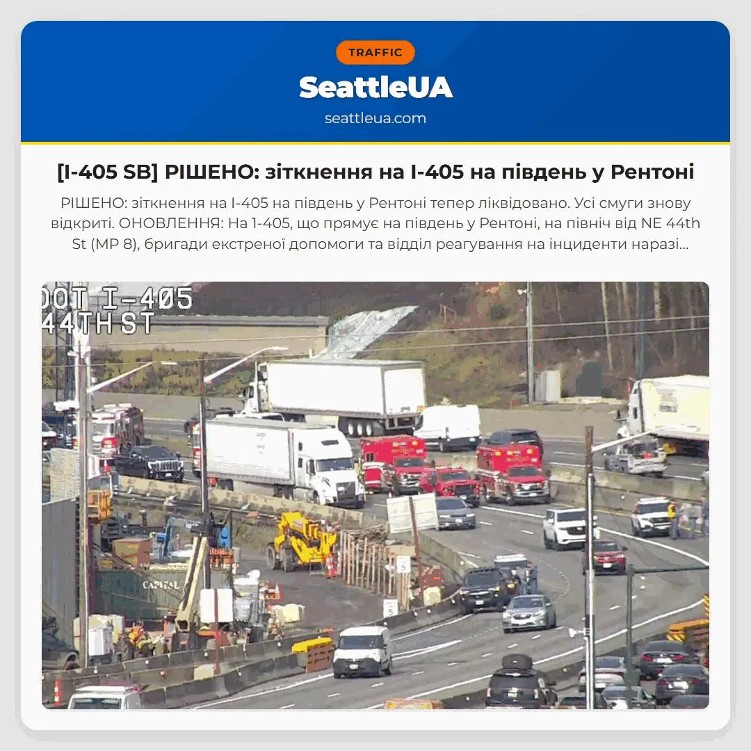 РІШЕНО: зіткнення на I-405 на південь у Рентоні тепер ліквідовано. Усі смуги знову відкриті. ОНОВЛЕННЯ: На 1-405, що прямує на південь у Рентоні, на північ від NE 44th St (MP 8), бригади екстреної допомоги та відділ реагування на інциденти наразі заблокували як смугу HOV, так і ліву смугу загального користування на місці зіткнення. Очікуйте затримки в цій області.