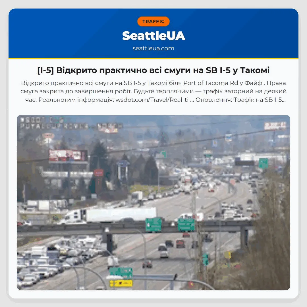 Відкрито практично всі смуги на SB I-5 у Такомі біля Port of Tacoma Rd у Файфі. Права смуга закрита до завершення робіт. Будьте терплячими — трафік заторний на деякий час. Реальнотим інформація: wsdot.com/Travel/Real-ti … Оновлення: Трафік на SB I-5 біля Port of Tacoma Rd у Файфі перенаправлено. Розгляньте альтернативні маршрути. Реальнотим інформація: wsdot.com/Travel/Real-ti …