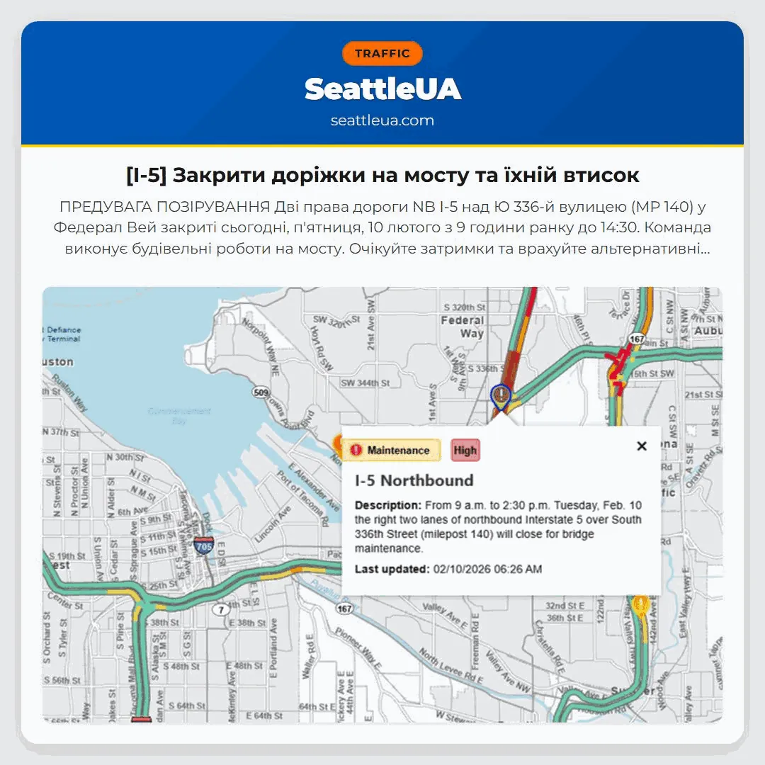 Дві права дороги NB I-5 над Ю 336-й вулицею (MP 140) у Федерал Вей закриті сьогодні, п’ятниця, 10 лютого з 9 години ранку до 14:30.