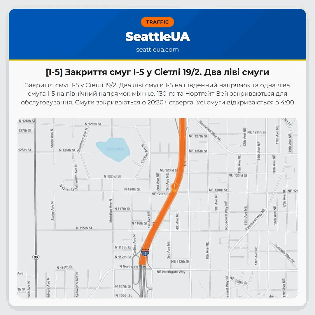Закриття смуг I-5 у Сіетлі 19/2. Два ліві смуги I-5 на південний напрямок та одна ліва смуга I-5 на північний напрямок між н.е. 130-го та Нортгейт Вей закриваються для обслуговування. Смуги закриваються о 20:30 четверга. Усі смуги відкриваються о 4:00 п’ятниці (20/2).