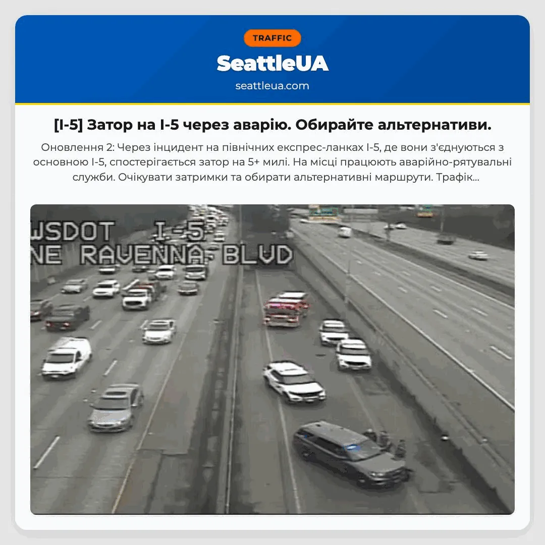 Оновлення 2: Через інцидент на північних експрес-ланках I-5, де вони з’єднуються з основною I-5, спостерігається затор на 5+ милі. На місці працюють аварійно-рятувальні служби. Очікувати затримки та обирати альтернативні маршрути. Трафік перенаправляється на міські вулиці. Оновлення: Вхід на експрес-ланки I-5 закритий на NE Ravenna St через зіткнення. На місці події присутні служби реагування на надзвичайні ситуації та поліція. Затримки можливі в цьому районі.