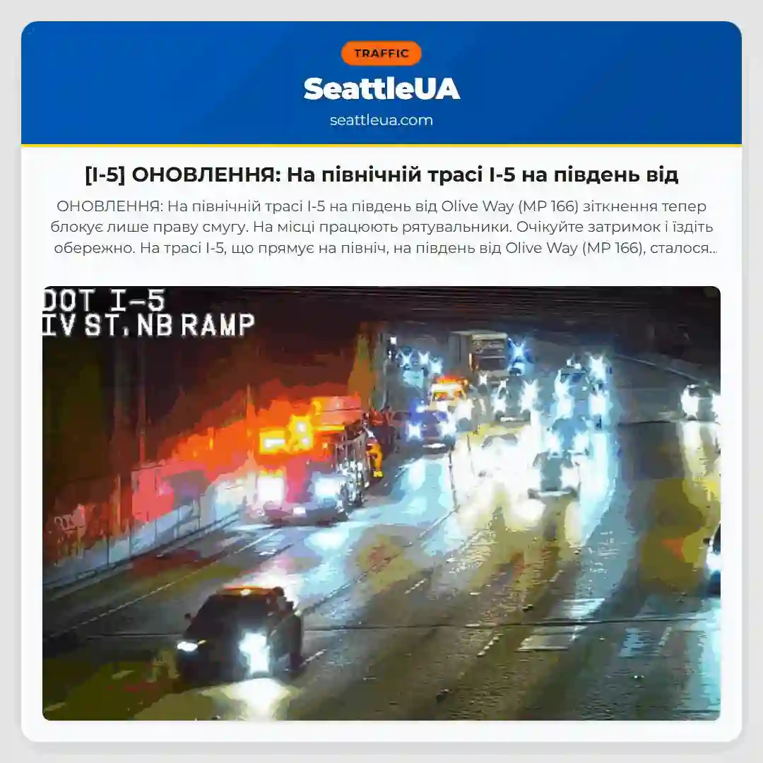 ОНОВЛЕННЯ: На північній трасі I-5 на південь від Olive Way (MP 166) зіткнення тепер блокує лише праву смугу.