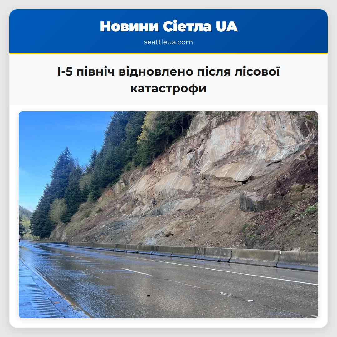 Водії, що рухаються північним напрямком на I-5 південніше Беллінгему, знову можуть використовувати обидва смуги після того, як лісова катастрофа зупинила дорогу протягом майже чотирьох тижнів. Обидва смуги північного напрямку I-5 відкрилися вівторка, на день раніше за заплановане, між мильними знаками 248 і 249. Закриття виникло через селю, яка відбулася 19 березня, за повідомленням Департаменту транспорту штату Вашингтон (WSDOT). 21 березня Департамент транспорту штату Вашингтон виконав екстрену угоду, і робітники почали працювати сім днів на тиждень, щоб стабілізувати скло та очистити сміття. Геотехнічні інженери провели остаточну перевірку, щоб підтвердити стабільність склу перед відкриттям північних смуг. Селю відбулася о 21:30 19 березня, коли 250-футова, 100-футова частина склу над північним напрямком I-5 відправила тисячі кубічних ярдів каміння, дерев і іншого сміття у близькі смуги. Каміння, деякі з яких були такі великі, як автобуси, а багато інших більші, ніж вантажівка, залишилися нестабільними і не підтриманими, повідомив Департамент транспорту штату Вашингтон. У тижні після селі спеціалізовані екіпажі спускалися по склу, щоб перевірити її та відштовхнути вільні камені вручну та за допомогою повітряних компресорів. Робітники виконали 2065 лінійних футів отворів у камені та закріпили 96 сталевих дротиків на глибину 15-25 футів, щоб стабілізувати склу. Під час робіт, які відбувалися від верху склу до нижньої частини, інші екіпажі видалило приблизно 7000 кубічних ярдів сміття – достатньо, щоб заповнити два олімпійські басейни – уздовж північного напрямку I-5. Департамент транспорту штату Вашингтон зазначив, що роботи виконувалися під наглядом геотехнічних інженерів на місці, які аналізували склу під час робіт, шукали потенційно нестабільні зони та розробляли плани для закріплення їх сталевими дротиками, щоб дорога могла безпечно відкритися.