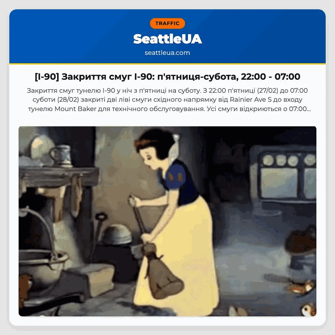 Закриття смуг тунелю I-90 у ніч з п’ятниці на суботу. З 22:00 п’ятниці (27/02) до 07:00 суботи (28/02) закриті дві ліві смуги східного напрямку від Rainier Ave S до входу тунелю Mount Baker для технічного обслуговування. Усі смуги відкриються о 07:00 суботи. Можливі затримки.
