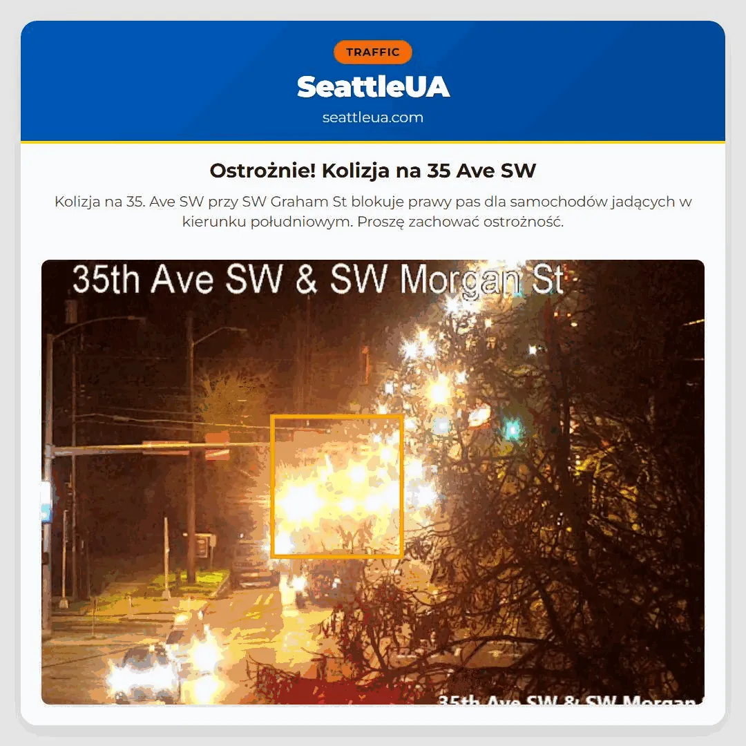 Kolizja na 35. Ave SW przy SW Graham St blokuje prawy pas dla samochodów jadących w kierunku południowym. Proszę zachować ostrożność.