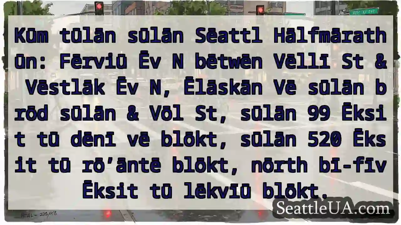 Kūm tūlān sūlān Sēattl Hālfmārathūn: Fērviū Ēv N bētwēn Vēllī St & Vēstlāk Ēv N, Ēlāskān Vē sūlān brōd sūlān & Vōl St, sūlān 99 Ēksit tū dēnī vē blōkt, sūlān 520 Ēksit tū rō’āntē blōkt, nōrth bī-fīv Ēksit tū lēkvīū blōkt.