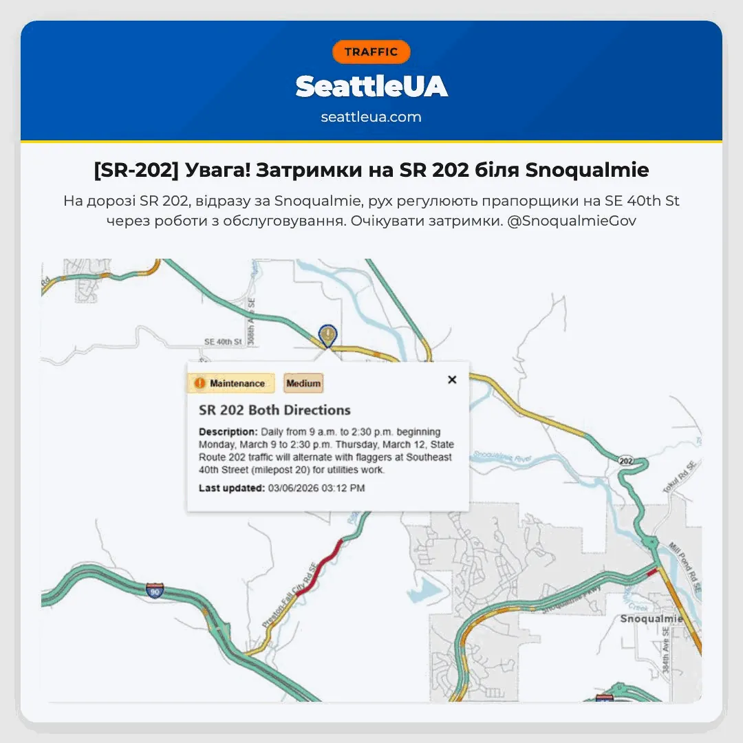 На дорозі SR 202, відразу за Snoqualmie, рух регулюють прапорщики на SE 40th St через роботи з обслуговування. Очікувати затримки. @SnoqualmieGov