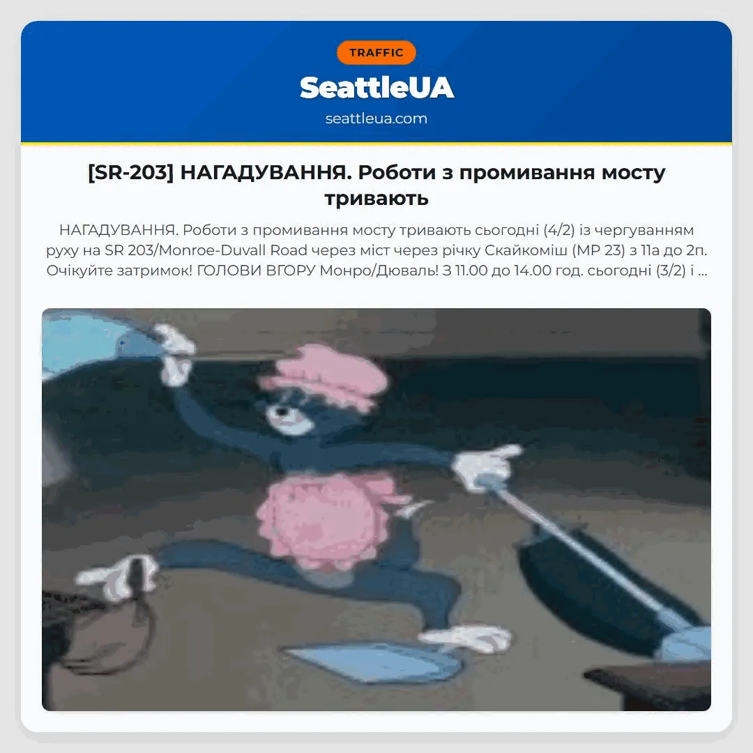 З 11.00 до 14.00 год. сьогодні (3/2) і в середу (4/2) бригади з технічного обслуговування мостів чергуватимуть рух на SR 203/Monroe-Duvall Road біля мосту через річку Скайкоміш (кілометровий стовп 23) для промивання/інспекції мосту.